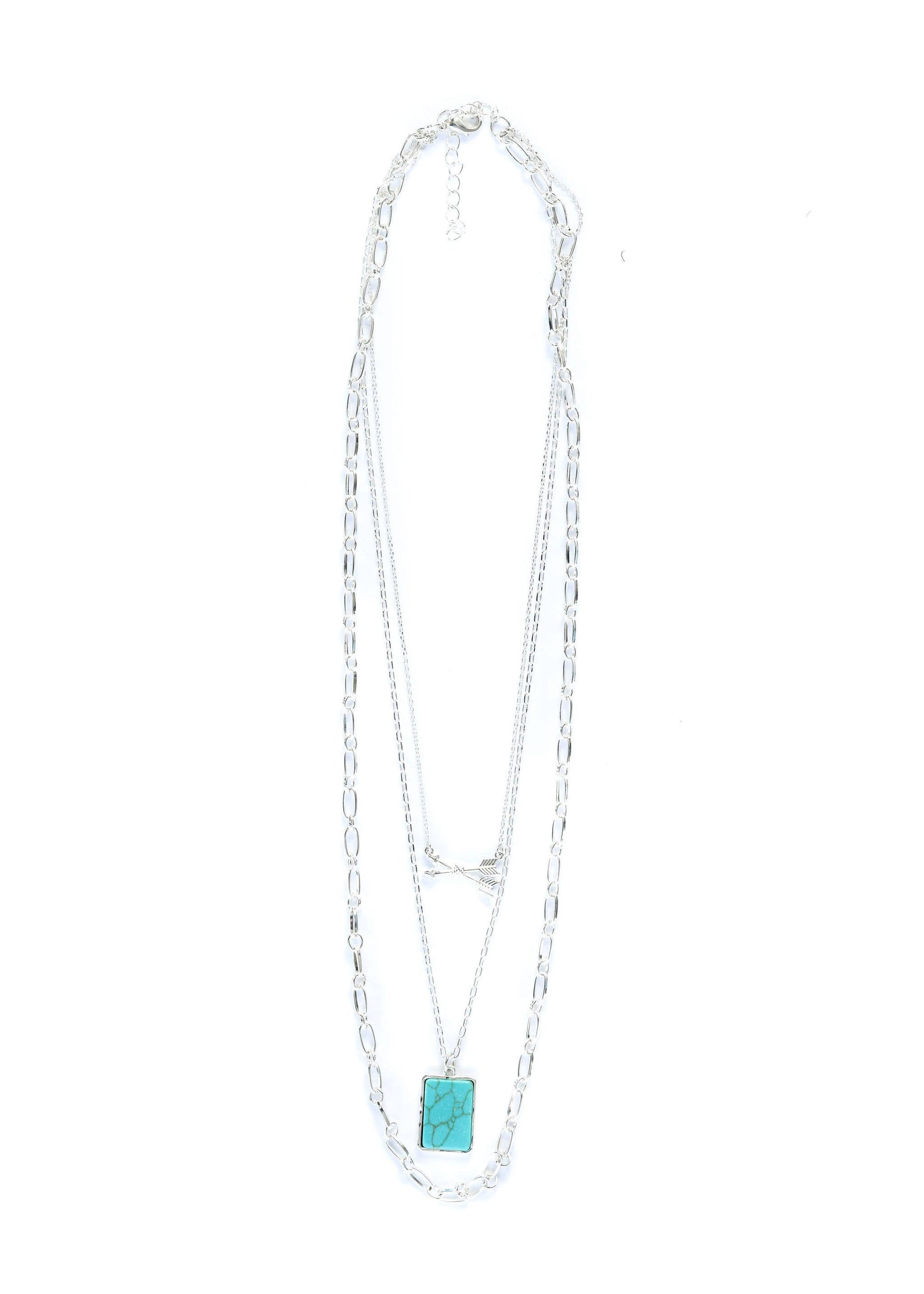 24" Layered Silver Chain Necklace with Arrows and Turquoise Bar Accents