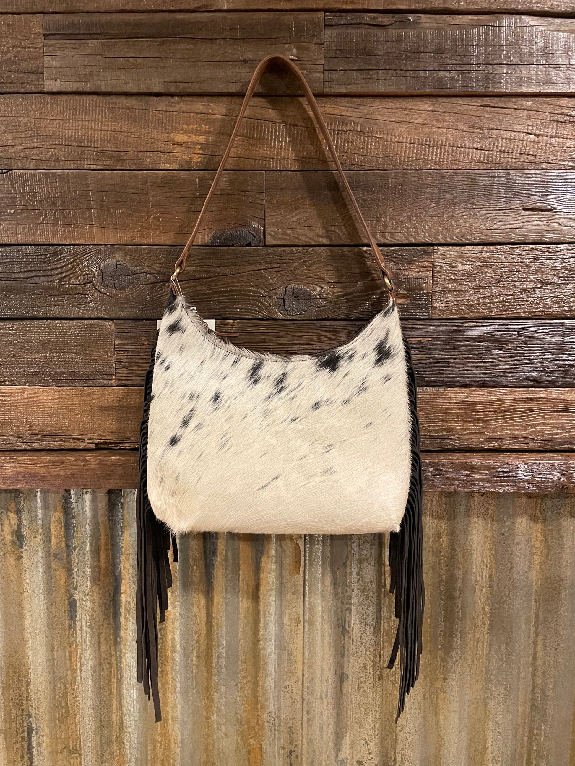 The Victoria Cowhide Purse by Countryside Co. is a luxurious addition to any wardrobe. Crafted with a beautiful cowhide front and leather back, this purse exudes elegance and sophistication. The side fringe adds a touch of playful charm, while the zipper closure and inside zipper pocket provide practicality. With a leather shoulder strap, this purse is the essence of style and convenience.